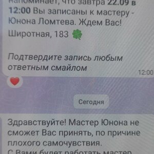 Отзыв о салоне!отношении руководителя к клиентам, которая не считает нужным при звонке представиться, за день пришло уведомление приду на стрижку или нет-подтверждаю! За час до посещения Лаборатории красоты Тюмень, Широтная, приходит сообщение, что мастер заболел (понимаю, всякое бывает, но не за час!),я еду из другого города(запись была за несколько дней), из другого района. Руководитель салона, при звонке, назвала меня 'неадекватным человеком", не спросив "удобно ли мне сейчас говорить"(еду в автобусе и в горле першило,поэтому ей показалось,что я веду себя агрессивно, неадекватно)). Грамотный Руководитель никогда не позвонит себе данное общение(и принимает любую критику), так как благодаря клиентам вы кушаете,живёте, получаете свой доход!